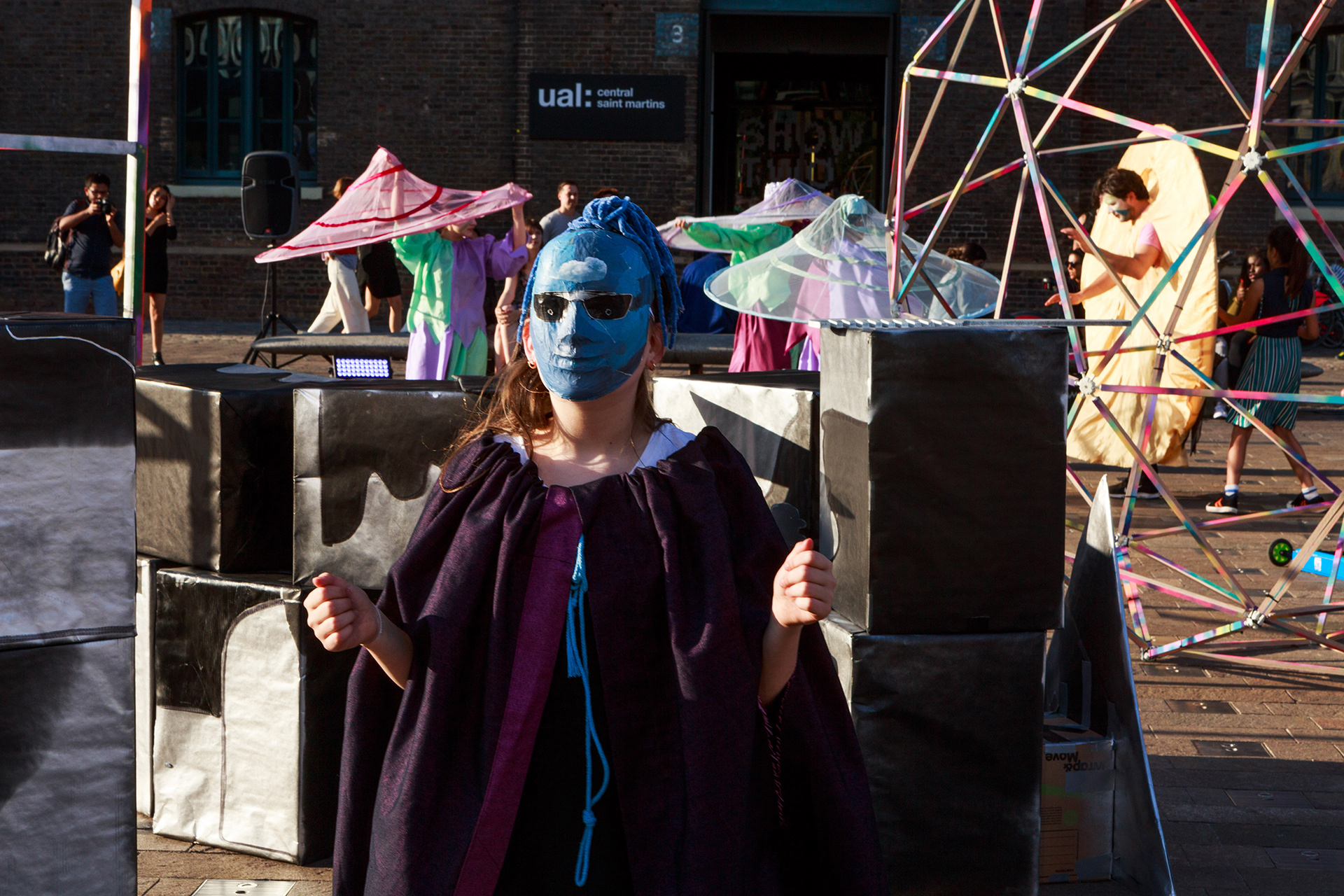Sara True in costume and headdress designed by Maggie Campbell within 'Aluminium Theatre Set' cube structure by Monika Kühne-Jørgensen, Mohini Mehta, Mita Vaghela, Saroj Patel and Christopher Pearson / Copyright © John Sturrock 2019