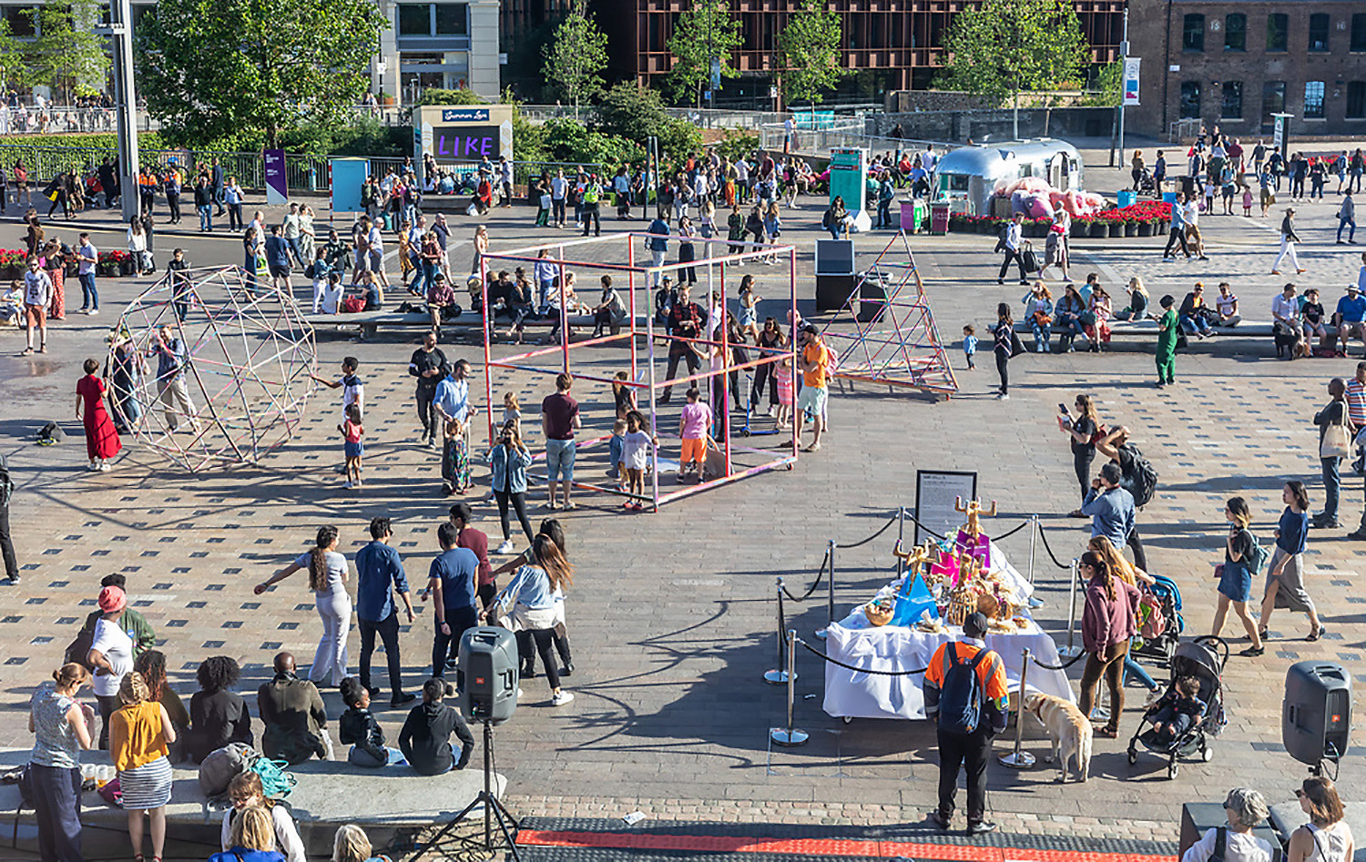 'Aluminium Theatre Set' (sphere, cube, pyramid, props, masks, capes, etc.) by Monika Kühne-Jørgensen, Mohini Mehta, Mita Vaghela, Saroj Patel and Christopher Pearson / Triangular banqueting table of edible bread sculptures by Sondos Azzam and Sarah Allen / Copyright © John Sturrock 2019